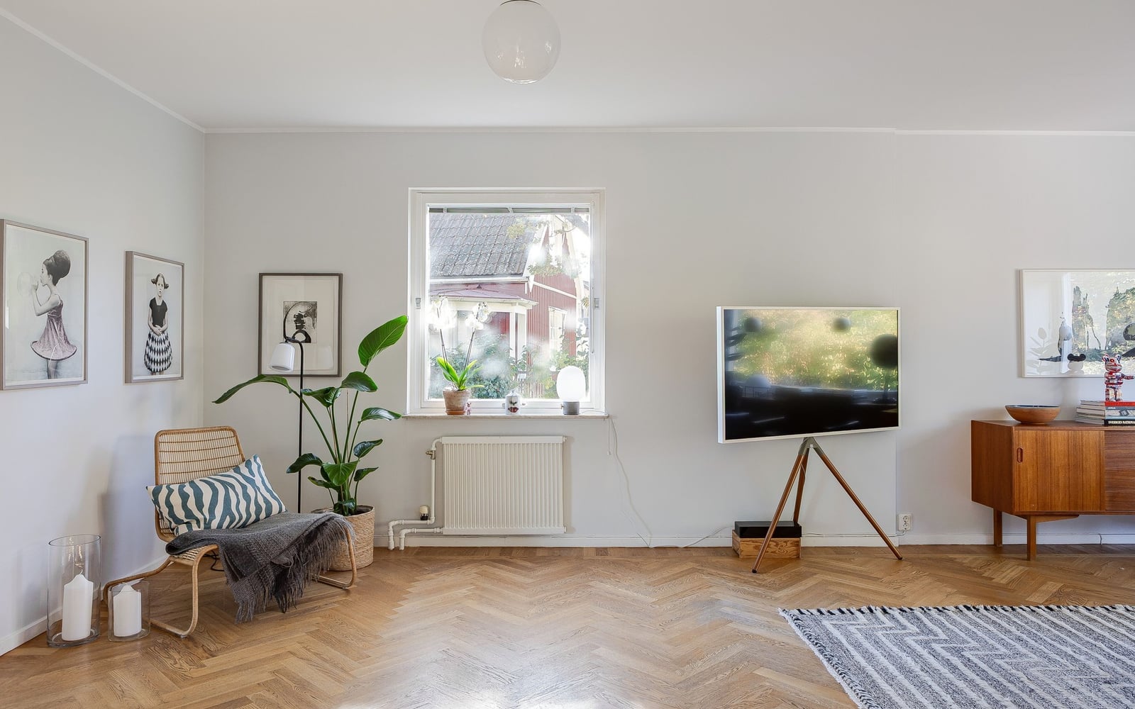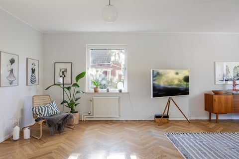 Vardagsrummet är rymligt och ljust genom stort fönster och det läckra burspråket från 60-talet samt vacker fiskbensparkett. Via skjutdörr från vardagsrummet når man den trevliga matsalen som ligger i anslutning till köket.
