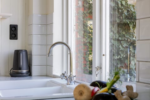 Det ljusa och välplanerade köket når man både via matsalen och den inre hallen. Köket har generöst med skåpsförvaring och bra med bänkytor i Carraramarmor samt trägolv och pärlspont i 1920-tals original. Glasade altandörrar leder ut till den breda och sittvänliga trappan och fantastiska trädgården. På planet finns det också en gästtoalett samt trappa till övre plan samt källarplan.