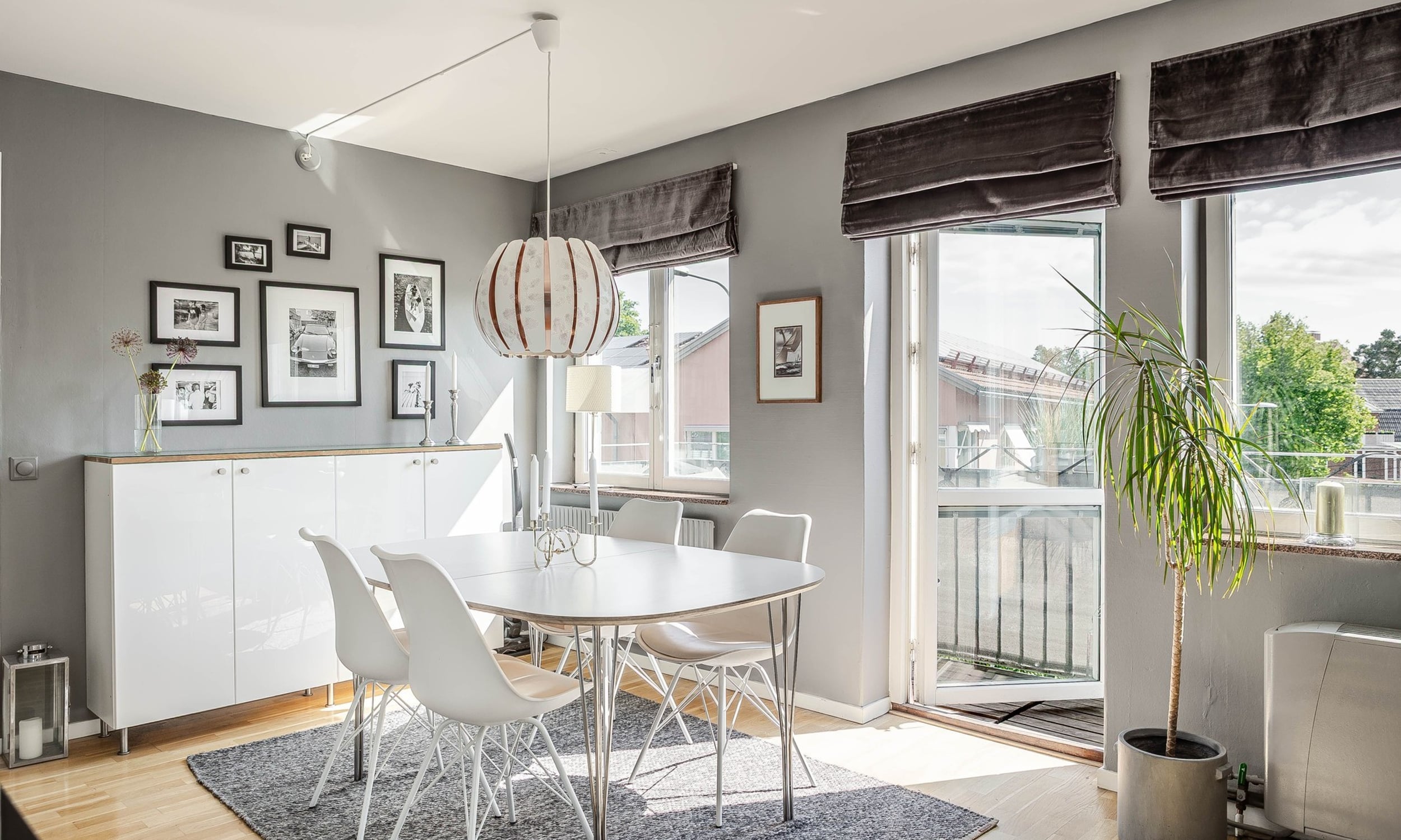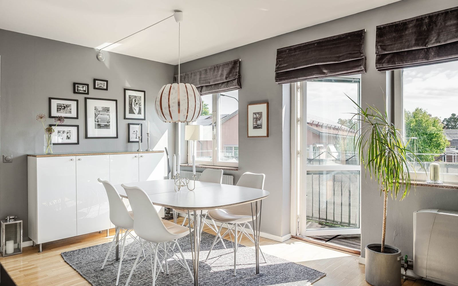 Det stilrena köket med matplats ligger i öppen planlösning mot vardagsrummet och har utgång till en lång balkong med vy mot parkområdet.