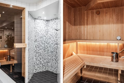 Badrummet är helkaklat och har klinkergolv med golvvärme, bubbelbadkar, handfat på kommod, handdukstork samt kombinerad tvättmaskin/torktumlare.
